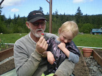 Here's Farmer Steve in his gorgeous orchard. He's worked extra hard at planting due to the fact that it takes a pick axe to get through the hard ground and rocks. Fruit trees were planted last year, raspberries, blueberries and marion berries have been added this year. Just beyond the orchard, caught up in the clouds of the day is Mount Baker, which makes for an awesome background. This peaceful setting, amazing site and wonderful structures are all the work of Steve's vision and understanding of what is needed to do things well. He is a blessing to all who work at the Friendship Garden.